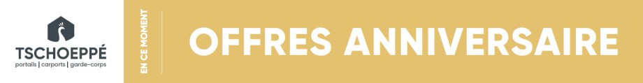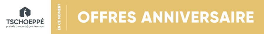* Offre valable pour toute commande signée entre le 1er et le 31 Octobre 2024 sur les portails et clôtures de la marque Tschoeppé (hors collections IMAGINE et AURORE), suivant conditions définies en magasin. Remise correspondant à 10 % de la valeur HT du portail ou de la clôture, hors motorisation, hors pose, avec un maximum de 1 000 € de remise par commande. Offre non cumulable avec d’autres promotions en cours et non cumulables avec des remises déjà consenties. L’offre est valable à partir de 3 000 € TTC d’achat sur les produits Tschoeppé. Voir conditions en magasin (9014 rue du Souillet, 27290 ECAQUELON).